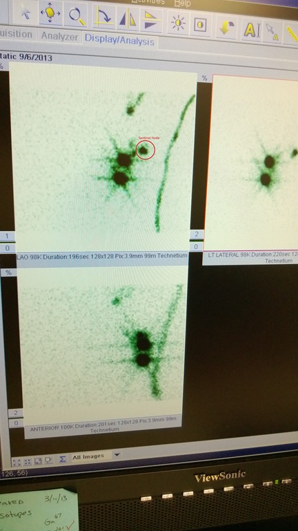 Finding the sentinel nodes with nuclear medicine was the next step which took about an hour. I wrote about that in Nuclear Blue. Because they had scheduled two hours just in case I needed it and it took less than an hour at this point I was almost back on schedule –maybe 15-20 minutes late.